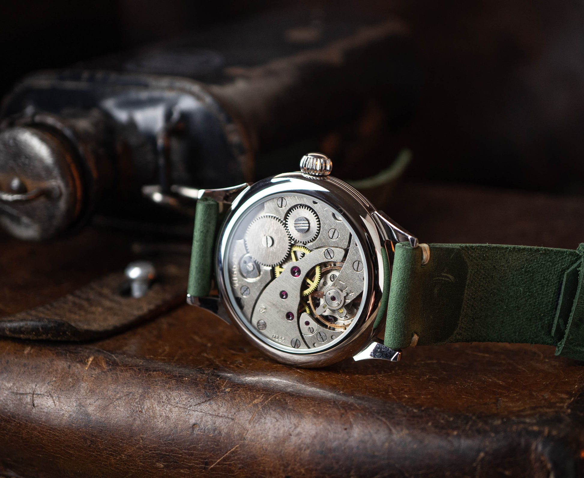 Vintage mechanism was produced in Eastern Europe in the 1980s, caliber 3602. The watch actually works and keeps time. You can adjust the time by pulling up the knob and turning it.
